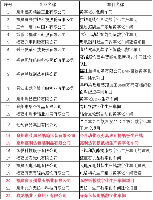 導語:福建省泉州市經濟和信息化委員會于12月25日公布了數字化車間項目擬確定情況,其中玖龍(泉州)等四家紙包裝企業的項目通過初步審核。 根據《泉州市經濟和信息化委員會關于開展2018年泉州市數字化車間項目申報工作的通知》(泉經信裝備〔2018〕662號)的要求,經企業自愿申報,各縣(市、區)經信部門初審推薦,專家評審、現場核查等業務流程,經研究決定,現將2018年泉州市數字化車間項目擬確定名單進行公示。 其中,共有三家紙包裝企業入選,分別為玖龍紙業(泉州)有限公司、泉州市佳鳳民紙箱包裝有限公司、泉州嘉利達包裝制品有限公司以及福建省泉州景玉紙業有限公司。詳情如下表所示: 2018年泉州市數字化車間擬確定項目表