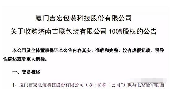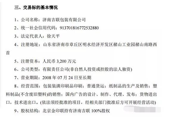 2018年12月29日,廈門吉宏包裝科技股份有限公司發(fā)布公告稱,擬與北京金印聯(lián)國際供應(yīng)鏈管理股份有限公司簽訂《股權(quán)轉(zhuǎn)讓協(xié)議》,以自有資金人民幣3370萬元收購北京金印聯(lián)持有濟(jì)南吉聯(lián)包裝有限公司100%股權(quán)。
