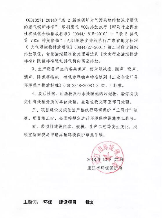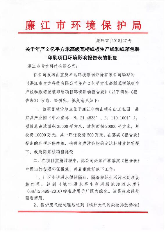 廣東省湛江市廉江市環境保護局于2018年12月29日發布了“關于年產2億平方米高級瓦楞紙板生產線和紙箱包裝印刷項目環境影響報告表的批復”。該項目總投資達1億元。 項目概況:關于湛江市青方科技有限公司年產2億平方米高級瓦楞紙板生產線和紙箱包裝印刷項目,其建設地點位于廉江市橫山鎮金山工業園一品家具產業園(中心坐標:N:21.4838°、E:110.1001°),項目總占地面積35000平方米,建筑面積20000平方米,總投資10000萬元,其中環保投資500萬元。在落實《報告表》提出的各項環保措施,確保各類污染物穩定達標排放的前提下,廉江市環境保護局同意該項目建設。 詳情如下圖所示: