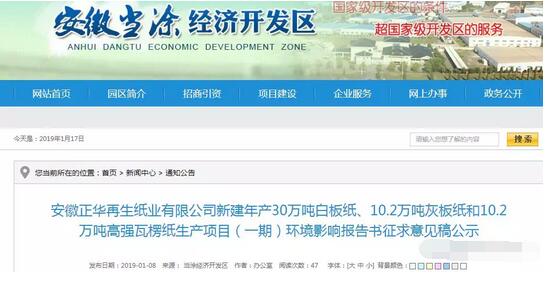 遷移外地:富陽市正華紙業(yè)在安徽設廠 1月8日,安徽省當涂經(jīng)濟開發(fā)區(qū)公示了一份項目環(huán)境影響報告書征求意見稿:安徽正華再生紙業(yè)新建年產(chǎn)30萬噸白板紙、10.2萬噸灰板紙和10.2萬噸高強瓦楞紙生產(chǎn)項目(一期)已經(jīng)立項,開始環(huán)評。
