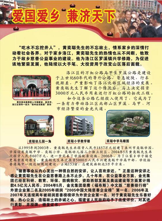 慈善公益 黃奕聰先生是一位愛鄉(xiāng)建鄉(xiāng)、造福桑梓的一代僑賢。他視家鄉(xiāng)發(fā)展為己任,傾一腔熱忱,為推動家鄉(xiāng)的改革開放和經(jīng)濟(jì)社會發(fā)展作出了重要貢獻(xiàn),捐建了小學(xué)、中學(xué)、大學(xué)、醫(yī)院、修路。如:奕聰小學(xué)、奕聰中學(xué)、金光隧道、奕聰科學(xué)樓……