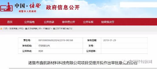 1月29日,浙江省諸暨市人民政府受理了諸暨市鑫航新材料科技有限公司項目,并擬作出審批意見。