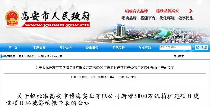 高安市人民政府近期受理了申請環(huán)評審批手續(xù)的高安市博海實業(yè)有限公司新增5000萬紙箱擴(kuò)建項目,項目的建設(shè)地點在江西省高安市八景工業(yè)園,屬于異地遷建擴(kuò)建項目。