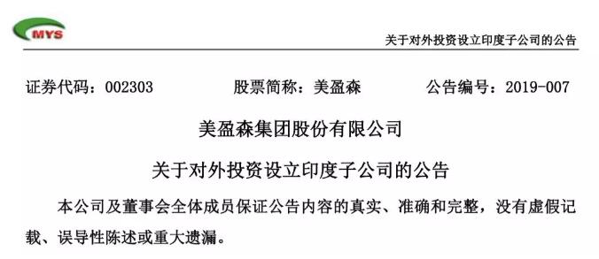 導(dǎo)語(yǔ):2月1日,美盈森發(fā)布關(guān)于擬投資不超5000萬(wàn)美元,對(duì)外投資設(shè)立印度子公司的公告。本次于印度進(jìn)行投資是公司向東南亞進(jìn)行戰(zhàn)略布局的重要一步,有利于分享包括印度在內(nèi)的一帶一路—東南亞沿線國(guó)家經(jīng)濟(jì)發(fā)展帶來(lái)的市場(chǎng)機(jī)遇,提升公司區(qū)域市場(chǎng)競(jìng)爭(zhēng)力,進(jìn)一步鞏固并提高公司行業(yè)地位,形成公司新的利潤(rùn)增長(zhǎng)點(diǎn)。