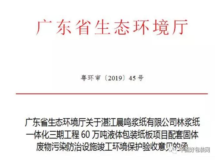 2月18日,廣東省建設項目環境保護審批網發布了“湛江晨鳴林漿紙一體化三期工程60萬噸液體包裝紙板項目環保驗收公告”。