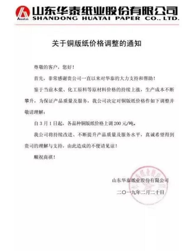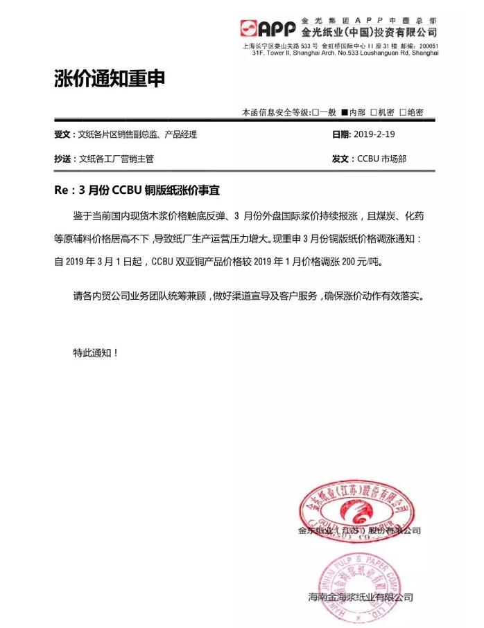 受高位外盤價(jià)格支撐,加之上期所針葉漿期貨價(jià)格連日上漲,現(xiàn)貨市場貿(mào)易商報(bào)價(jià)堅(jiān)挺,期現(xiàn)貨價(jià)差不斷收窄。但下游主要紙種近期提漲阻力較大,紙廠對高位漿價(jià)持觀望態(tài)度,多以按需采購為主,內(nèi)外盤市場高位成交均較為僵持。 現(xiàn)貨價(jià)格方面,針葉漿銀星5,700-5,750元/噸,凱利普5,800-5,850元/噸,雄獅5,750元/噸,金獅5,900元/噸,馬牌5,750元/噸,北木6,200元/噸,阿拉巴馬5,650元/噸,烏針5,650元/噸,闊葉漿明星5,700元/噸,鸚鵡5,700元/噸,小鳥5,650-5,700元/噸,本色漿金星5,900元/噸,化機(jī)漿昆河4,600元/噸。 期貨方面,2月22日上期所紙漿期貨1906主力合約收盤價(jià)5,670元/噸,結(jié)算參考價(jià)5,626元/噸,較前結(jié)算價(jià)上漲64元/噸,成交560,956手,持倉194,514手。 受木漿價(jià)格反彈等成本壓力驅(qū)動,銅版紙價(jià)格開始松動,紙廠通過發(fā)布漲價(jià)函嘗試上漲。APP、太陽紙業(yè)、華泰紙業(yè)發(fā)布漲價(jià)函,最遲于3月1日起,銅版紙產(chǎn)品將上漲200元/噸、