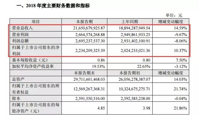 2018 年度,公司實現(xiàn)營業(yè)利潤266,457萬元,比去年同期減少28,529萬元,同比降低9.67%;利潤總額為269,524萬元,比去年同期減少23,616萬元,同比降低8.06%;產(chǎn)能釋放及銷售量增加同時致使產(chǎn)品銷售成本也比去年同期有所增加,且增長幅度高于銷售收入增長致使利潤總額有所下降。