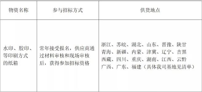 2月26日,杭州娃哈哈集團發布了2019年紙箱供應商征集公告,全國紙箱需求額約20億元。在今年61個紙箱配套生產基地中,有20個基地緊缺優秀供應商,有意向的紙箱廠趕緊報名。 一、招標物資