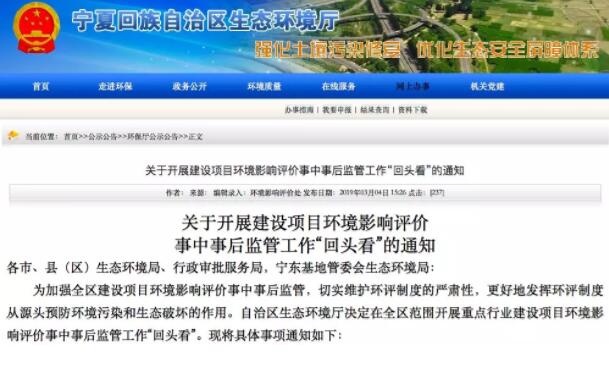 導語:近日,寧夏自治區生態環境廳發布《關于開展建設項目環境影響評價事中事后監管工作“回頭看”的通知》,決定在全區范圍內對造紙等行業項目環境影響報告書開展為期4個月的“回頭看”審查。