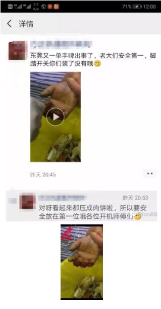 自深圳石巖啤機師傅發生安全事故后,近日,又一段小視頻在各大啤機群轉發!事發地點正在調查中..... 視頻內容不忍直視就不上傳了,網友直呼“太恐怖啦!”