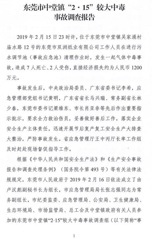 2019年2月15日23時許,位于東莞市中堂鎮吳家涌村廟水路12號的東莞市雙洲紙業有限公司工作人員在進行污水調節池(事故應急池)清理作業時,發生一起氣體中毒事故,造成7人死亡、2人受傷,直接經濟損失約為人民幣1200萬元。