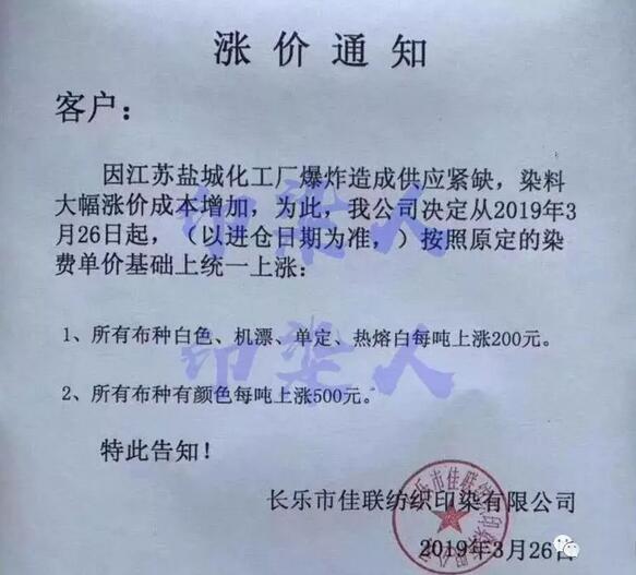 相比此次江蘇爆炸事故對于萬華化學的影響,多家染料中間體企業才是最為直接的承擔者,在展開全國性的安全大檢查之后,部分地區將面臨緊急停產。 上千個企業實施限停產 截止目前,已經有河南省、浙江省金華市、鹽城市、蘇州市、宿遷市、濰坊市、東莞等7個地區上千個企業實施限停產政策。此次事故的重大影響加上部分企業的緊急停產導致市場染料及其部分原材料價格大幅上漲。浙江龍盛作為目前行業內“第一大”間苯二胺供應商,近期因為核心中間體間苯二胺漲價4天3漲停。
