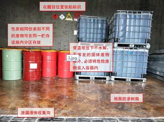 規(guī)范要點(diǎn): 1.危險(xiǎn)廢物貯存設(shè)施應(yīng)建在易燃、易爆等危險(xiǎn)品倉庫、高壓輸電線路防護(hù)區(qū)域以外。 2.貯存場(chǎng)所地面須硬化處理,并涂至少2mm密度高的環(huán)氧樹脂,以防止?jié)B漏和腐蝕。 3.必須有泄漏液體收集裝置(收集溝及收集井,以收集滲濾液,防止外溢流失現(xiàn)象)、氣體導(dǎo)出口及氣體凈化裝置。設(shè)施內(nèi)要有安全照明設(shè)施和觀察窗口。 4.用以存放裝載液體、半固體危險(xiǎn)廢物容器的地方,必須有耐腐蝕的硬化地面,且表面無裂隙。 5.應(yīng)設(shè)計(jì)堵截泄漏的裙腳,地面與裙腳所圍建的容積不低于堵截最大容器的最大儲(chǔ)量或總儲(chǔ)量的五分之一。 6.不相容的危險(xiǎn)廢物必須分開存放,并設(shè)有隔離間隔斷。 二.危險(xiǎn)廢物貯存容器 檢查內(nèi)容: 1.盛裝危險(xiǎn)廢物的容器是否完好無損。 2.盛裝危險(xiǎn)廢物的容器和包裝是否全部粘貼了危險(xiǎn)廢物標(biāo)簽。 圖片示例: