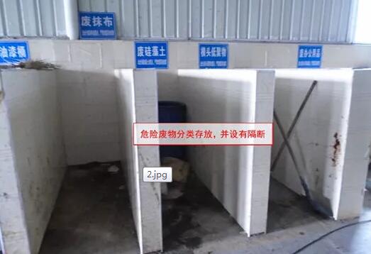 規(guī)范要點(diǎn): 1.裝載危險(xiǎn)廢物的容器必須完好無損。 2.盛裝危險(xiǎn)廢物的容器材質(zhì)和襯里要與危險(xiǎn)廢物相容(不相互反應(yīng))。 3.裝載液體、半固體危險(xiǎn)廢物的容器內(nèi)須留足夠空間,容器頂部與液體表面之間保留100mm以上的空間。 4.盛裝危險(xiǎn)廢物的容器上必須粘貼符合《危險(xiǎn)廢物貯存污染控制標(biāo)準(zhǔn)》 附錄A所示的標(biāo)簽。 三.危險(xiǎn)廢物堆放 檢查內(nèi)容: 1.是否按照危險(xiǎn)廢物特性分類進(jìn)行收集、貯存。 2.堆放高度、墻距等是否符合規(guī)范。 圖片示例: