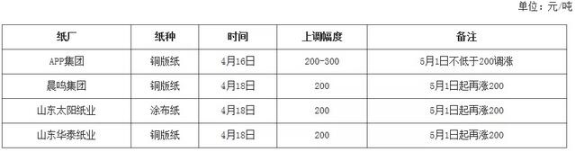4月份以來,銅版紙市場呈現(xiàn)上揚趨勢,3月下旬發(fā)布的漲價函本月執(zhí)行尚可,紙廠價格提漲,市場價格隨之跟漲200元/噸左右。此次價格提漲主要受以下三方面影響:第一,紙廠開工不足,庫存水平不高,市場供應(yīng)量偏緊;第二,紙廠協(xié)同性較強,銷售尚可。第三,下游業(yè)者對此次漲價多較為認可,且4月份為文化紙傳統(tǒng)旺季,價格提漲較為順利。近日規(guī)模紙廠再發(fā)漲價函,具體內(nèi)容如下: