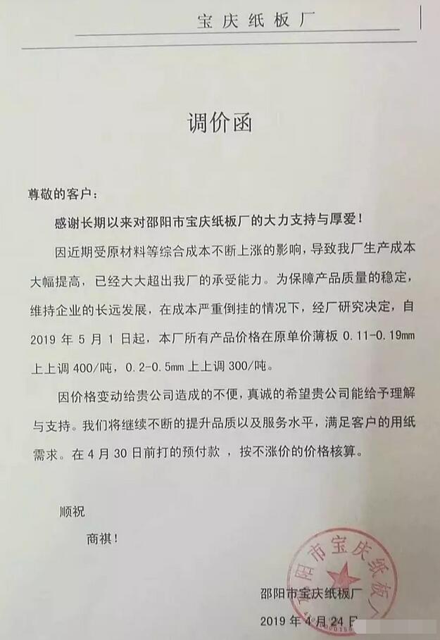 寶慶紙板廠:因近期受原材料等綜合成本不斷上漲的影響,自5月1日起,本廠所有產(chǎn)品價(jià)格在原單價(jià)薄板0.11-0.19mm上調(diào)400/噸,0.2-0.5mm上調(diào)300/噸。
