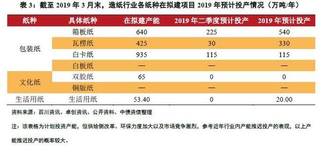 (四)行業(yè)價(jià)格回顧與展望 2019年一季度,除箱板紙龍頭提價(jià)使得箱板紙均價(jià)環(huán)比小幅上漲外,其余包裝紙、文化紙及生活用紙均價(jià)主要受需求減弱影響,環(huán)比均出現(xiàn)一定的下滑,各紙種下滑幅度有所不同,按下滑幅度由大到小依次為銅版紙、雙膠紙、白卡紙、生活用紙、白板紙、瓦楞紙。而各紙種一季度均價(jià)同比均出現(xiàn)較為明顯的下降。 二季度,各紙種價(jià)格走勢不一,箱板瓦楞紙方面,以玖龍紙業(yè)和博匯紙業(yè)為主的新增產(chǎn)能陸續(xù)釋放增加供給壓力,而需求難有實(shí)質(zhì)性好轉(zhuǎn),預(yù)計(jì)供給增速高于需求增速,而成本端廢紙價(jià)格上漲空間對(duì)箱板瓦楞紙價(jià)格支撐有限,預(yù)計(jì)箱板瓦楞紙價(jià)格伴隨供給提升而小幅下滑。白卡紙方面,博匯紙業(yè)75萬噸白卡紙產(chǎn)能投產(chǎn),行業(yè)供給增速大于需求增速,但考慮主要廠家博匯紙業(yè)、太陽紙業(yè)等提價(jià)(4月份已發(fā)布提價(jià)函),預(yù)計(jì)白卡紙均價(jià)環(huán)比小幅上漲的可能性較大。白板紙方面,一季度浙江富陽地區(qū)100萬噸產(chǎn)能出清利好釋放完畢,二季度供需端基本維持,成本端支撐有限,預(yù)計(jì)二季度白板紙均價(jià)環(huán)比持平或微幅上漲。文化紙方面,秋季教材教輔招標(biāo)可為二季度的雙膠紙和銅版紙價(jià)格形成支撐,供給端2019年無文化紙產(chǎn)能投放,銅版紙和雙膠紙均價(jià)環(huán)比上升的可能性較大,但同比仍呈下降趨勢。生活用紙方面,需求具有一定剛性,2018年末投產(chǎn)的產(chǎn)能在2019年一季度已全部釋放,二季度供需關(guān)系可基本維持一季度,而成本端木漿價(jià)格小幅提升形成一定支撐,預(yù)計(jì)二季度生活用紙均價(jià)環(huán)比小幅上漲,同比有所下降。