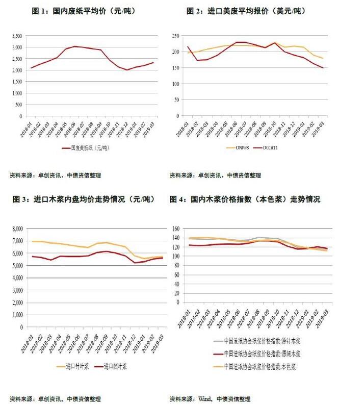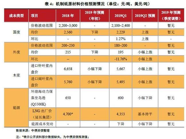 二季度,行業(yè)計(jì)劃投產(chǎn)產(chǎn)能為370萬噸,但成本端的持續(xù)高企、環(huán)保力度的持續(xù)嚴(yán)厲依然倒逼中小產(chǎn)能退出,但退出空間逐步縮小,考慮供給側(cè)改革、環(huán)保力度加大以及市場競爭激烈,參考近年行業(yè)內(nèi)產(chǎn)能推遲投產(chǎn)的表現(xiàn),以上產(chǎn)能推遲投產(chǎn)的概率很大。預(yù)計(jì)行業(yè)實(shí)際凈增產(chǎn)能50萬噸左右。行業(yè)供給增速環(huán)比上升,2019年全年供給增速與2018年基本保持一致的預(yù)測保持不變。 (三)行業(yè)成本回顧與展望 2019年一季度,廢紙方面,國內(nèi)廢紙價(jià)格延續(xù)2018年四季度以來的超跌反彈,但受箱板瓦楞紙進(jìn)口量及進(jìn)口廢紙漿量同比增長影響,國內(nèi)廢紙價(jià)格環(huán)比增長幅度有限,國廢黃板紙平均價(jià)格2,221元/噸,環(huán)比上漲1.83%。外廢配額一季度(2019年前四批次)共審批554萬噸,同比增長135萬噸,外廢價(jià)格環(huán)比下降超10%,2019年一季度,外廢價(jià)格較國廢低約900元/噸~1,100元/噸,價(jià)差環(huán)比擴(kuò)大約250元/噸~350元/噸。因外廢配額主要集中在行業(yè)龍頭企業(yè)手中,且國內(nèi)和國外廢紙來源占比分別約為7:3,因此行業(yè)廢紙成本環(huán)比小幅上漲。木漿方面,一季度,國內(nèi)木漿和進(jìn)口木漿價(jià)格同比和環(huán)比均出現(xiàn)下滑,其中針葉漿、闊葉漿和本色漿分別環(huán)比下降11%、3%和12%。整體看,行業(yè)木漿成本環(huán)比下降。能源方面,一季度,天然氣出廠價(jià)格(延長集團(tuán))和環(huán)渤海動(dòng)力煤秦皇島港:平倉價(jià):山西優(yōu)混(Q5500K)平均價(jià)分別環(huán)比下降5.90%和4.76%,能源成本有所下降。考慮原材料成本占比約75%,行業(yè)整體成本微幅上升。 二季度,廢紙方面,第六批進(jìn)口廢紙批量暴跌,進(jìn)口廢紙政策依然嚴(yán)厲,進(jìn)口廢紙和國廢的供給偏緊,同時(shí)下游玖龍紙業(yè)等箱板瓦楞紙產(chǎn)能投產(chǎn)等增加對(duì)廢紙需求,廢紙價(jià)格將繼續(xù)上升。但考慮成品紙終端需求仍難以實(shí)質(zhì)好轉(zhuǎn),預(yù)計(jì)廢紙價(jià)格上升空間有限。木漿方面,3~5月份為秋季教輔教材招標(biāo)時(shí)間,文化紙需求可支撐木漿價(jià)格,預(yù)計(jì)木漿價(jià)格環(huán)比小幅上升。能源方面,煤炭需求進(jìn)入淡季,價(jià)格環(huán)比繼續(xù)下滑,而天然氣價(jià)格可維持相對(duì)高位,能源成本環(huán)比大概率繼續(xù)下滑。整體看,受原材料價(jià)格上漲的推動(dòng),行業(yè)整體生產(chǎn)成本繼續(xù)上升。