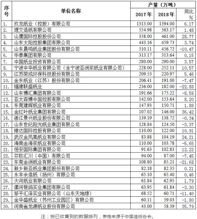 導(dǎo)語:近兩年,為了積極響應(yīng)環(huán)保政策,造紙大省廣東率先開始關(guān)停“兩高一低”造紙企業(yè)。隨之,全國各地掀起了密集的淘汰落后造紙產(chǎn)能、關(guān)停僵尸企業(yè)的大潮。根據(jù)日前中國造紙協(xié)會發(fā)布的《中國造紙工業(yè)2018年度報告》可以看出,關(guān)停大潮下造紙產(chǎn)能越來越集中,逼出了30家造紙巨無霸。而玖龍紙業(yè)成為了唯一的千萬噸級紙廠,穩(wěn)居霸主地位。已經(jīng)歷過了環(huán)保風(fēng)暴、落后產(chǎn)能清退、原材料爭奪戰(zhàn)等多番市場檢驗,相信這些紙廠都將成為各區(qū)域市場最終的大贏家。 2018年重點造紙企業(yè)產(chǎn)量前30名企業(yè)