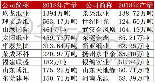 1、2018造紙企業(yè)產(chǎn)量前30強(qiáng),紙箱原紙廠占據(jù)半壁江山 5月6日,中國造紙協(xié)會發(fā)布《中國造紙工業(yè)2018年度報告》,這是反映造紙行業(yè)發(fā)展最權(quán)威的年度報告,每年發(fā)布一次。中國造紙協(xié)會的調(diào)查顯示,2018年全國紙及紙板行業(yè)有2700家企業(yè),并公示了產(chǎn)量前30強(qiáng)企業(yè)。 在30強(qiáng)中,紙箱原紙廠有18家: 據(jù)統(tǒng)計,在30強(qiáng)中紙箱原紙廠有18家,占比60%。包括玖龍紙業(yè)、理文造紙、山鷹國際、太陽紙業(yè)、華泰集團(tuán)、榮成環(huán)科、福建聯(lián)盛紙業(yè)、山東博匯集團(tuán)、東莞建暉紙業(yè)、浙江景興紙業(yè)、山東世紀(jì)陽光、武漢金鳳凰紙業(yè)、東莞金洲紙業(yè)、新鄉(xiāng)新亞紙業(yè)集團(tuán)、揚(yáng)州永豐余集團(tuán)、銀鴿實業(yè)、山東天地緣、河南龍源紙業(yè)。