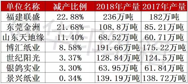 玖龍紙業(yè)以1394萬噸列第一位,理文造紙和山鷹國際分列二、三位,形成國內(nèi)包裝紙廠三足鼎立之勢。 在30強(qiáng)中,年產(chǎn)量超過100萬噸的有21家: 據(jù)統(tǒng)計,在30強(qiáng)中,年產(chǎn)量超過100萬噸的有21家企業(yè)。包括玖龍紙業(yè)、理文造紙、山鷹國際、太陽紙業(yè)、晨鳴紙業(yè)、華泰集團(tuán)、中國紙業(yè)投資、寧波中華紙業(yè)、榮成環(huán)科、金東紙業(yè)、福建聯(lián)盛、山東博匯、亞太森博、東莞建暉、金紅葉、景興紙業(yè)、山東世紀(jì)陽光、維達(dá)國際、武漢金鳳凰、海南金海漿、恒安國際。在今年的名單中,年產(chǎn)量超過100萬噸的企業(yè)數(shù)量較2017年多了2家。 在30強(qiáng)中,有12家企業(yè)產(chǎn)量出現(xiàn)負(fù)增長: 小編發(fā)現(xiàn),2018年造紙產(chǎn)業(yè)有一個非常明顯的現(xiàn)象:減產(chǎn),尤其是紙箱原紙產(chǎn)能上表現(xiàn)得非常明顯。在12家產(chǎn)量出現(xiàn)負(fù)增長的企業(yè)中,有7家是紙箱原紙廠,占比58%。而在減產(chǎn)達(dá)到10%以上的企業(yè)中,有3家是紙箱原紙廠。這說明在新的經(jīng)濟(jì)環(huán)境下,紙箱原紙企業(yè)在根據(jù)市場情況做出理性調(diào)整,不再是一味的追求盲目擴(kuò)張,也預(yù)示著企業(yè)更加注重內(nèi)部修煉,而非單純的體量競爭。 按照減產(chǎn)從多到少排序為:福建聯(lián)盛紙業(yè)減產(chǎn)22.88%;東莞金洲減產(chǎn)21.68%;山東天地緣減產(chǎn)11.40%;晨鳴紙業(yè)減產(chǎn)10.47%;山東博匯紙業(yè)減產(chǎn)8.58%;金東紙業(yè)減產(chǎn)7.47%;芬歐匯川減產(chǎn)7.45%;海南金海漿減產(chǎn)5.56%;世紀(jì)陽光紙業(yè)減產(chǎn)3.37%;銀鴿實業(yè)減產(chǎn)3.30%;金華盛紙業(yè)減產(chǎn)1.80%;景興紙業(yè)減產(chǎn)0.34%。