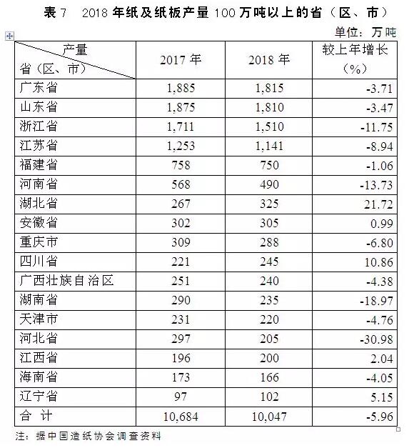 紙及紙板產(chǎn)量超過100萬噸的省17個: 粗略統(tǒng)計發(fā)現(xiàn),2018年紙及紙板產(chǎn)量超過100萬噸的省份有17個:按照產(chǎn)量從高到底排列分別是廣東、山東、浙江、江蘇、福建、河南、湖北、安徽、重慶、四川、廣西、湖南、天津、河北、江西、海南、遼寧。產(chǎn)量合計10047萬噸,占全國紙及紙板總產(chǎn)量的96.28%。