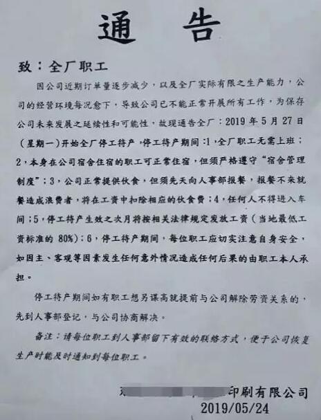 現階段的紙箱行情完全不如往年,不少同行都有暫時停產、停工的想法,可是卻又擔心庫存積壓和客戶丟失。 5月24日,東莞一知名印刷廠向全體員工發出停工待產通知: