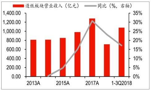 2018年中國造紙行業市場概況 供給端,2018年下半年開始行業新增產能投產增多,預計2018-2019年整體新增產能在1400萬噸;需求端,與宏觀經濟關聯性較高的包裝紙、銅版紙需求或將承壓,供需格局預計在2019年將有所惡化,供需關系從緊平衡轉向供給過剩。 至2018年9月底造紙板塊累計固定資產投資完成額達到2137萬元,累計同比增長5.8%,較2017年底1.2%的同比增速有顯著回升。 2018年前三季度造紙板塊實現營收1079億元,同比增長17%;實現歸母凈利潤100億元,同比增長14%。三季度旺季需求不及預期,成品紙價格出現回調,同時原材料價格高位震蕩,Q3單季板塊營收增速回落至7%,歸母凈利增速下滑至-0.2%。 2013-2018年前三季度中國造紙板塊營業收入、歸母凈利潤統計及增長情況