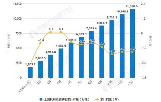 數據來源:公開資料、前瞻產業研究院整理 2018年全國機制紙及紙板產量已超億噸 據前瞻產業研究院發布的《中國造紙行業發展前景與投資戰略規劃分析報告》統計數據顯示,2018年1-3季度全國機制紙及紙板產量波動幅度較小,整體呈下降趨勢,2018年3-4季度全國機制紙及紙板產量下降;2018年12月全國機制紙及紙板產量為1043萬噸,同比增長2.8%。2018年1-12月全國機制紙及紙板產量為11660.6萬噸,同比下降1.5%。 2018年1-12月全國機制紙及紙板產量統計及增長情況