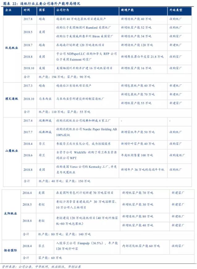 2、橫向擴張:漿紙布局雙管齊下,傳統邊界正在慢慢消失 海外擴張節奏:歐美收購成熟紙企改造,東南亞新建漿紙廠擴產。18年我國龍頭紙企加速出海、外延動作頻繁,具體可分為(1)收購派:玖龍紙業、山鷹紙業均通過收購美國、歐洲等地漿紙廠以便于獲得高質量的外廢原料;(2)建廠派:理文造紙、太陽紙業,則選擇在老撾、越南、馬來西亞等東南亞人工成本較低的地區布局延續勞動力成本紅利。針對國內造紙行業海外原材料依賴較嚴重、低端產品需求逐漸飽和的困境,龍頭企業率先選擇在海外進行產能布局或建設原料基地增厚行業競爭實力。
