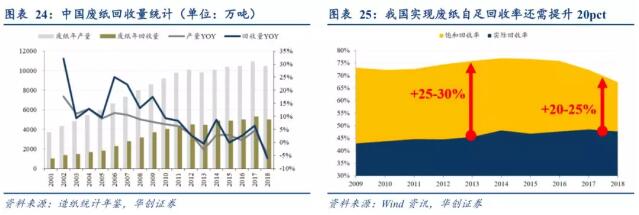 3、縱向閉環:產業鏈向上建立廢紙回收,向下開拓包裝業務 國內廢紙回收率實現自給仍差20~25%,國廢補足外廢缺口尚需時間。2018年我國廢紙年回收量達4964萬噸,與前年基本持平,下游造紙對于廢紙的需求量達7027萬噸,同比減少10.8%,存在2063萬噸的供給缺口;其中廢紙年回收量達4964萬噸,實際回收率僅47.6%(=廢紙回收量/廢紙年產量*100%)。根據我們的測算,在不考慮廢紙具體細分需求結構情況下,國內廢紙完全實現自給,即自給回收率(=廢紙年需求量/廢紙年產量*100%)需達到67.4%,18年我國廢紙自給不飽和度(=自給回收率-實際回收率)尚有19.8pct距離;從過去廢紙行業經驗來看,2009年我國廢紙行業回收率首次突破40%,2009-2018年間累計提升4.7pct,增勢較為緩慢;盡管《輕工業發展規劃(2016-2020年)》中提及“我國未來將加大國內廢紙回收體系建設,降低原料對外依賴過高的風險”,從廢紙回收的實際情況來看,我們可以判斷未來幾年廢紙行業依賴外廢原料補充國廢缺口的局勢不會驟變。
