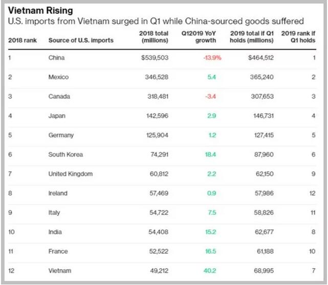 在貿(mào)易戰(zhàn)背景下,今年第一季度中國對(duì)美出口下降13.9%;上月包括日本、韓國、新加坡和臺(tái)灣等區(qū)域主要經(jīng)濟(jì)體對(duì)美出口也都出現(xiàn)下滑,而越南上月對(duì)美出口同比增長7.5%。 彭博社分析指出,受美國對(duì)中國加征關(guān)稅影響,許多企業(yè)紛紛將供應(yīng)鏈轉(zhuǎn)移到越南,越南本身也具備勞動(dòng)力成本低、營商氣氛不斷改善的優(yōu)勢,這些都成為促進(jìn)越南經(jīng)濟(jì)增長的積極因素。