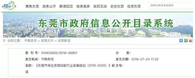 《東莞市再生資源回收行業發展規劃(2019-2025)》解讀 為構建科學合理的再生資源回收體系,促進再生資源回收提質升級,引導行業規范化、集約化、規模化發展,近日,東莞市再生資源回收管理工作領導小組辦公室印發了《東莞市再生資源回收行業發展規劃(2019-2025)》(東再資辦〔2019〕8號,以下簡稱《發展規劃》)。為了更好地理解和貫徹執行《發展規劃》,東莞市商務局對有關內容解讀如下: 一、關于《發展規劃》編制的背景及目的 2015年,商務部出臺《再生資源回收體系建設中長期規劃(2015-2020)》,以深化改革、轉變發展方式和發展綠色流通為主線,圍繞規范回收利用秩序,提高回收利用率,加強再生資源回收管理法律法規建設,推進再生資源回收管理體制改革和回收模式創新,提升再生資源回收行業規范化水平和規模化程度,推動構建多元化回收、集中分揀和拆解、安全儲存運輸和無害化處理的先進完整的回收體系,為再生資源回收行業提供了明確的發展目標、清晰的發展思路、完整的發展體系和有效制度保障。 當前,市委市政府把美麗東莞建設作為貫徹落實黨的十九大精神的重要舉措,通過城市升級引領經濟社會綜合轉型,提升城市品質內涵和中心城區首位度。為進一步貫徹落實國家關于再生資源回收工作的主要精神,根據市委市政府的具體工作部署,通過制定《發展規劃》,構建東莞特色再生資源回收體系,引導再生資源回收市場規范發展,完善行業監管機制,促進再生資源回收行業綠色轉型升級,助推“灣區都市、品質東莞”建設。 二、關于《發展規劃》主要內容 《發展規劃》共七章節,結構框架如下: (一)總則,主要包括規劃背景、規劃依據、規劃范圍與對象、規劃期限等內容。 (二)行業發展基礎,主要分析目前我市回收行業發展現狀及存在問題。 (三)行業發展趨勢,主要對行業未來發展預測及國內先進城市有關政策措施進行分析,梳理總結有益的借鑒經驗。 (四)規劃總體思路,明確規劃的指導思想、基本原則及發展目標。 (五)再生資源回收體系建設,主要從回收體系建設思路、網點構成及網點建設要求等方面闡述回收體系構建的主要內容及要點。 (六)主要任務,明確了規劃實施期間重點落實鎮(街道、園區)回收網點規劃編制、行業整治、監管機制健全、龍頭示范企業培育、交易管理平臺搭建、行業協會建設及“兩網”銜接試點工程探索等七大任務。 (七)實施保障,明確提出了組織保障、政策保障、信息保障、隊伍建設及宣傳推廣等五個措施,推進行業規劃貫徹實施。 三、關于《發展規劃》主要亮點 (一)明確行業規劃的對象范圍。該《發展規劃》的規劃對象涉及業態和業種兩方面:業態方面主要包括回收點、中轉站、分揀中心等從事再生資源回收經營活動的企業和個體工商戶等。業種方面主要為固體廢棄物,不包括氣體和液體,也不包括有毒有害固廢、醫療廢物、建筑垃圾和餐廚垃圾。重點包括廢舊日用品生活性再生資源的回收、生活垃圾中可回收部分以及生產性再生資源的回收,不包括再生資源的利用。 (二)明晰行業規劃的發展目標。通過7年努力,到2025年實現6項目標: 1、落實再生資源回收行業建設用地規劃; 2、按照布局要求,完成再生資源回收網點建設; 3、85%以上回收人員納入規范化管理; 4、主要再生資源回收率達85%以上; 5、回收服務覆蓋達100%; 6、引進或培育規范收集、安全儲運、環保分揀等回收綜合服務能力較強的再生資源回收龍頭示范企業。 (三)分類建立再生資源回收網絡體系。《發展規劃》明確提出針對再生資源產生源不同,分類建立再生資源回收體系:構建以回收點為基礎、中轉站為節點、分揀中心為樞紐的生活性再生資源回收網絡體系和以中轉站、分揀中心為核心,實現產廢、利廢有效銜接的生產性再生資源回收體系。同時,對于回收點、中轉站及分揀中心等回收網點,進一步明確功能定位、布局原則及面積要求,并強調回收網點在選址、建筑設施和回收經營等有關規定。 (四)明確提出七大重點任務。為實現總體發展目標要求,按照先易后難、分步實施工作思路,逐步推進七大主要任務:1、編制鎮(街道、園區)回收網點設置規劃;2、開展再生資源回收行業整治;3、健全行業長效監管機制;4、培育龍頭示范企業及推廣創新回收模式;5、拓展再生資源交易管理平臺;6、發揮行業協會引領作用;7、探索“兩網”銜接試點工程。
