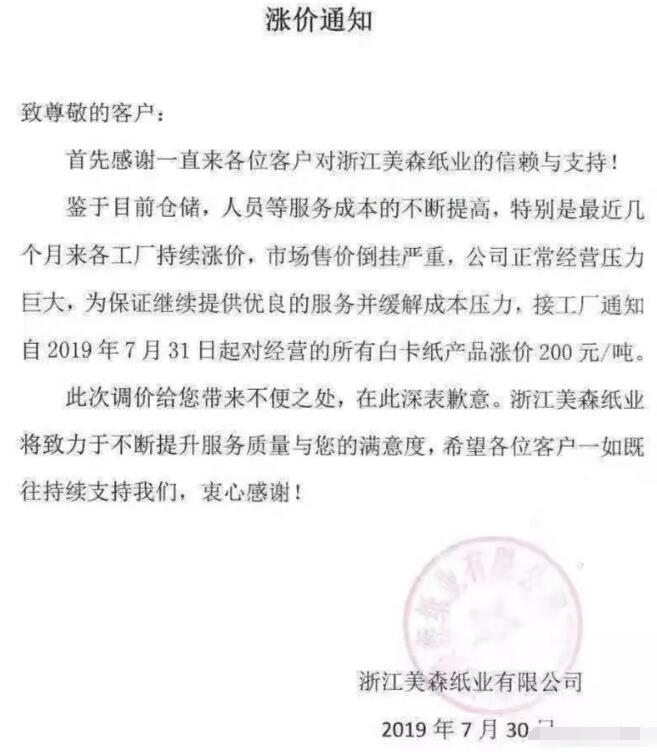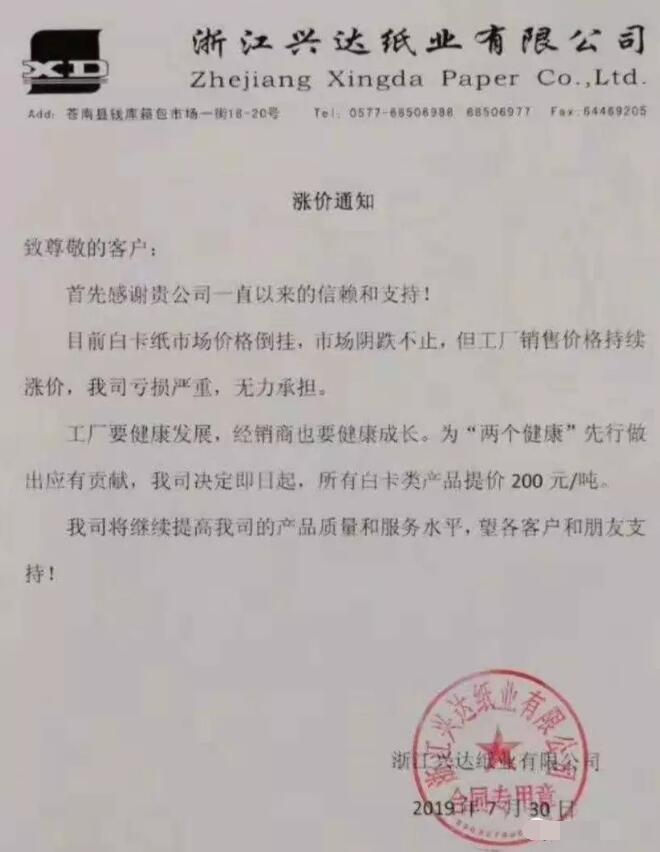 蒼南縣永興紙業:鑒于目前各項服務成本提高,特別是各工廠持續漲價,決定2019年7月31日起對經營的所有白卡產品價格漲價200元/噸。