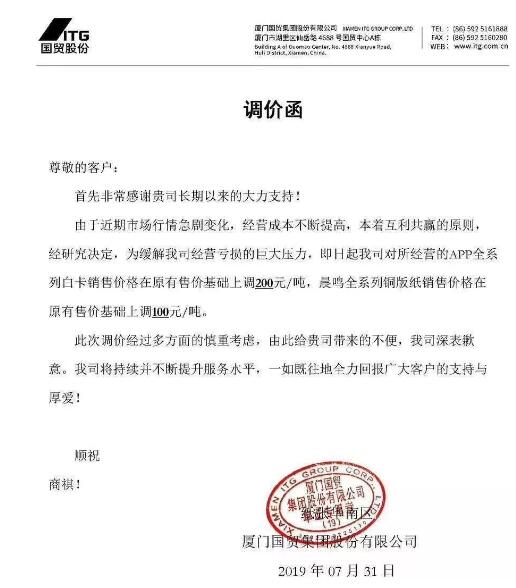 廈門國貿:即日起我司對所經營的APP全系列白卡銷售價格在原有售價基礎上上調200元/噸,晨鳴全系列銅版紙銷售價格在原有售價基礎上調100元/噸。