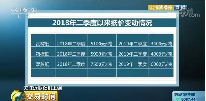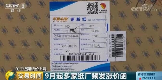 包裝紙方面,瓦楞紙價格從去年二季度5100元/噸上方,一路跌至今年二季度的3400元/噸左右,箱板紙也從5900元/噸附近跌至迫近4000元/噸;文化紙類雙膠紙價格從2018年二季度7500元/噸,到今年一季度跌至6000元/噸下方。 進入九月份,造紙業迎來行業旺季,全國多家紙廠此前已陸續發布漲價通知函。 央視走訪發現,這波漲價潮波及多個紙種,漲幅在50-200元/噸 上海中華印刷有限公司是國內規模最大的出版印刷企業之一,這里的采購供應部經理朱勇明告訴記者,公司每年會加工4-5萬噸的文化紙,其中超過一半的原材料都要從國內幾家大型造紙企業購買,前幾天公司已收到了來自上游造紙企業的漲價通知函。 上海中華印刷有限公司采購部經理 朱勇明:去年紙價漲到一定程度就降下來,今年年初的時候紙價非常低,平均大概在6000元/噸以下。今年到教材印制之前,開始陸續漲價了,這個月我們已經接到漲價通知函了。 8月13日,吉林省白山市琦祥紙業有限公司發布漲價函稱,將高強瓦楞紙90克、100克、110克、120克等品種在原有價格基礎上上調100元/噸,成為此輪紙價大范圍調漲的第一張漲價函。 隨后,華南、華北、華中地區的多家造紙廠陸續發布漲價通知,8月下旬,山東晨鳴、太陽紙業、金光紙業等行業龍頭公司也紛紛發出漲價通知。
