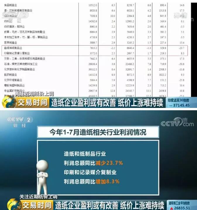 據國家統計局公布的數據,今年1-7月份,造紙和紙制品行業利潤總額同比減少23.7%,印刷和記錄媒介復制業1-7月利潤總額同比增加8.3%。