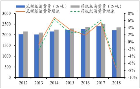 一、包裝紙行業發展現狀:需求增長空間大,供給端增速放緩 受宏觀經濟下行影響和順應紙箱輕量化趨勢,包裝紙消費需求增速放緩。包裝用紙下游主要是零售業,包括家電、日化、食品飲料和電子產品等消費品。從2015年起我國社會消費品零售總額增長放緩。2018年社會消費品零售總額增速為4%,處于近期十年中較低水平。下游消費需求不振,使得包裝紙行業發展承壓。目前中國紙包裝行業也向輕量化進行轉型,導致原紙使用量降低。宏觀經濟下行疊加順應紙箱輕量化趨勢,使得我國包裝紙消費需求增速放緩。2012-2017年,瓦楞原紙和箱紙板的消費量分別從2027/2157萬噸增長至2396/2510萬噸,CAGR分別為2.56%和2.83%。2018年,外廢額度收緊導致國廢價格上升,疊加下游需求較弱,瓦楞原紙和箱紙板的消費量分別為2213/2345萬噸,同比下降7.64%/6.57%。 瓦楞紙及箱板紙消費量及增速