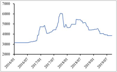 數據來源:公共資料整理 行業景氣度下行,預計短期包裝紙價格仍將承壓,長期紙價趨于穩定。2018年受到國廢價格高位運行和下游需求減弱的影響,瓦楞紙和箱板紙價格高位回落,行業景氣度下行。2019年上半年造紙行業依舊處于下行周期,同時受中美貿易戰影響,需求持續偏弱,紙價上行承壓。從19年初至今,箱板瓦楞紙庫存不斷提高,今年7月庫存天數達到20.42天,接近17年歷史庫存高位22.22天。庫存高企疊加下游需求疲弱,預計19年包裝紙價格仍將承壓。從長期來看,受制于供給端增量有限,且未來包裝紙需求增長空間大,預計長期紙價將趨于穩定。 箱板紙國內市場價格(元/噸)