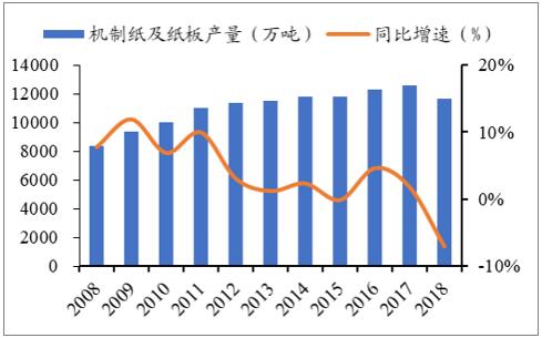 數據來源:公共資料整理 環保政策趨嚴,去產能持續推進,供給端增速放緩。國家通過提高企業排放標準和環保要求,來淘汰造紙行業內的落后產能,實現國家供給側改革去產能的目標!笆濉逼陂g,全國共淘汰落后產能3433萬噸,“十三五”期間,國家計劃進一步淘汰800萬噸落后產能。在去產能的背景下,造紙行業供給逐漸放緩,2012-2018年全國紙及紙板產量從11257.70萬噸增長至11712.50萬噸,CAGR為0.48%,2018年產量同比下降7.03%,行業去產能效果明顯。 2008-2018年紙及紙板產量及增速