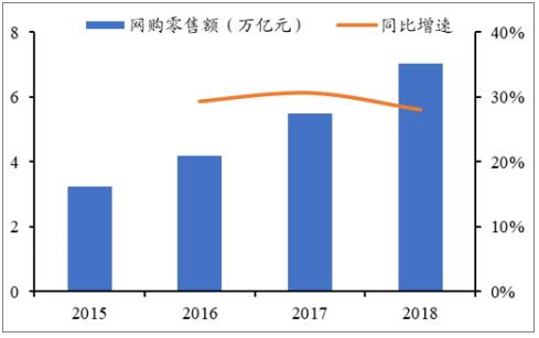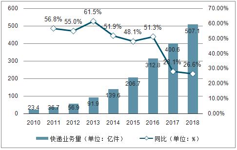 數據來源:公共資料整理 2.電商迅速發展成為包裝紙增長的動力之一 近20年來,中國經濟快速增長,紙包裝業務收入也快速增加。盡管近年來中國經濟增速出現下滑,但是6%以上的經濟增長速度在全球范圍內仍然屬于高速增長,經濟增長對包裝紙需求的拉動作用還在繼續。在經濟發展的大背景下,中國的電商快遞業務從無到有,尤其是2008年以來,快遞業務的收入規模和快遞數量都呈現出井噴式增長,即便近年來增速有所下滑,但是也還是維持在20%以上的超高增長速度,屬于行業從初期的野蠻式增長到逐漸成熟階段的自然過渡。電商業務的快速發展離不開與之相配的線下物流和快遞配送,受電子商務、快遞物流快速發展的拉動,中國的紙包裝業務收入在三種主流包裝形式(紙包裝、塑料包裝、金屬包裝)中一枝獨秀,也呈現出井噴式增長的態勢。 2018年,我國快遞服務企業業務量達到507.1億件,同比增長26.6%?爝f業務增量為106.5億件,快送業務量及増量均創歷史新高。我國日均快件處理量達到1.4億件,最高日處理量達到4.2億件,同比增長25.7%。2010-2018年,我國快遞業務量年均復合增長率達46.9%,是同期國內生產總值增速的6倍以上,增速居現代服務業前列,是我國新經濟的代表行業。我國快遞業務量超過美、日、歐發達經濟體之和,占全球快遞包裹市場份額的一半以上。我國快遞業務量規模連續五年穩居世第一,成為全球快遞包市場發展的動力源和穩定器。 2010-2018年快遞業務量變動情況(單位:億件,%)