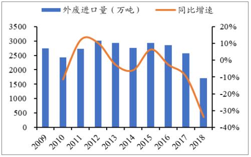 數據來源:公共資料整理 3.外廢政策收緊支撐國廢價格,原材料決定企業長期發展 外廢政策持續收緊,支撐國廢價格。由于國家對環保的重視程度不斷加大,對進口廢紙的管控愈加嚴格,進口廢紙配額逐年降低。2018年進口廢紙配額為1816萬噸,同比下降35%,外廢配額大幅減少迫使造紙企業用國廢代替外廢,國廢需求增加推動了國廢價格的上漲。國廢價格自2017年8月開始快速上漲,從1722元/噸上漲至2018年5月的2928噸/元,漲幅高達70.03%。2018年國廢均價為2591噸/元,同比提升34.10%。國廢價格從2018年二季度開始回落,2019年8月底國廢價格為2048元/噸,與18年的價格高位相比下降了30.05%,但相比17年的價格水平仍有提高。內外廢價差在2017年最高達到1563元/噸,今年下半年內外廢差價基本維持在950元/噸左右。未來隨著外廢政策持續收緊,預計國廢價格中樞上移 2009-2018年外廢進口量及增速