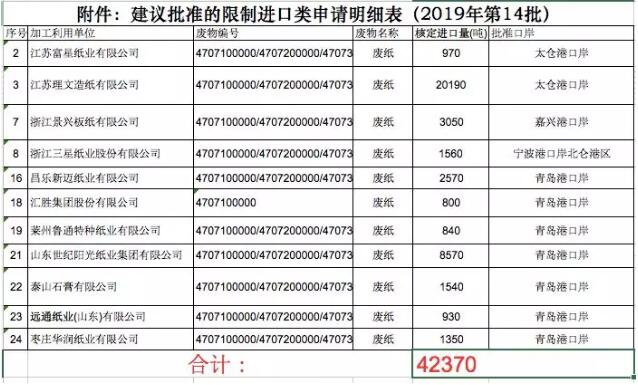 2019年11月5日,固廢中心公布的2019年第14批限制進口類申請明細表顯示,共計廢紙核定進口總量為4.237萬噸。