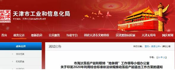 4月10日,天津市工業和信息化局網站發布《天津市2020年利用綜合標準依法依規推動落后產能退出的工作方案》(以下簡稱《方案》)。該《方案》提出將以鋼鐵、水泥、電解鋁、平板玻璃、造紙等行業為重點嚴格按照綜合標準依法依規有序推進,促使一批能耗、環保、安全、質量、技術達不到標準和生產不合格產品或淘汰類產能依法依規關停退出,嚴防“地條鋼”死灰復燃,促進環境質量持續改善,產業結構持續優化。