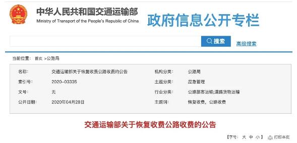 一、交通運輸部關于恢復收費公路收費的公告 經國務院同意,恢復全國收費公路收費,F將有關事宜公告如下: 一、恢復收費時間。自2020年5月6日零時起,經依法批準的收費公路恢復收費(含收費橋梁和隧道)。 二、繼續落實法定免費通行政策。符合《收費公路管理條例》及相關規定的軍隊車輛(含武警部隊車輛),公安機關在轄區內收費公路上處理交通事故、執行正常巡邏任務和處置突發事件的統一標志的制式警車,懸掛應急救援專用號牌的國家綜合性消防救援車輛,經國務院交通主管部門或者省、自治區、直轄市人民政府批準執行搶險救災任務的車輛,鮮活農產品運輸車輛,進行跨區作業的聯合收割機和運輸聯合收割機(包括插秧機)的車輛,繼續享受免收車輛通行費政策。 三、保障疫情防控應急運輸車輛優先便捷通行。新冠肺炎疫情防控常態化期間,高速公路收費站設置專用快捷通道,加強現場通行秩序引導維護,保障疫情防控等應急運輸車輛優先便捷通行。 特此公告。 交通運輸部 2020年4月28日 二、解讀 | 收費公路恢復收費若干問題問答 為統籌疫情防控和經濟社會發展,經國務院同意,從2020年2月17日零時起,全國收費公路免收車輛通行費。免費政策實施以來,各地交通運輸主管部門和收費公路經營管理單位堅決服從疫情防控大局,采取有力有效措施,免費不免服務,有力促進了疫情防控、復工復產和經濟社會秩序恢復,取得良好社會效果。 經國務院同意,從5月6日零時起,全國收費公路將恢復收費,現將大家比較關心的一些問題簡要介紹如下: 1、收費公路從什么時候開始恢復收費? 經國務院同意,從2020年5月6日零時起,經依法批準的收費公路恢復收取車輛通行費。其中,開放式收費高速公路和普通公路以車輛通過收費站收費車道的時間為準,封閉高速公路以車輛通過出口車道的時間為準。符合《收費公路管理條例》及相關規定的軍隊車輛(含武警部隊車輛),公安機關在轄區內收費公路上處理交通事故、執行正常巡邏任務和處置突發事件的統一標志的制式警車,經國務院交通主管部門或者省、自治區、直轄市人民政府批準執行搶險救災任務的車輛,鮮活農產品運輸車輛,進行跨區作業的聯合收割機、運輸聯合收割機(包括插秧機)的車輛,以及懸掛應急救援專用號牌的國家綜合性消防救援車輛,繼續依法享受免交車輛通行費政策。 。、新冠肺炎疫情防控物資應急運輸車輛通行高速公路是否繼續享受“三不一優先”政策? 在新冠肺炎疫情防控常態化期間,對疫情防控物資運輸車輛將依法實行分類服務和保障:一是對運輸疫情防控所需救治消毒藥品、醫療救護設備器械等緊急物資的車輛,按照《突發公共衛生事件交通應急規定》(衛生部、交通部2004年第2號令),辦理《緊急運輸通行證》,繼續執行“三不一優先”政策。其中,跨省運送緊急物資的,應當使用交通運輸部統一印制的《緊急運輸通行證》;省內運送緊急物資的,可以使用省級交通行政主管部門統一印制的《緊急運輸通行證》。二是對運輸疫情防控緊急物資以外的生活、生產等物資的車輛,高速公路收費站將設置專用快捷通道,加強現場通行秩序引導維護,保障其優先便捷通行。 。、收費標準是如何確定的? 根據《收費公路管理條例》的規定,車輛通行費的收費標準,應當根據公路的技術等級、投資總額、當地物價指數、償還貸款或者有償集資款的期限和收回投資的期限以及交通量等因素計算提出。其中,政府還貸公路的收費標準,由省級交通主管部門會同同級價格主管部門、財政部門審核后,報省級人民政府審查批準;經營性公路的收費標準,由省級交通主管部門會同同級價格主管部門審核后,報省級人民政府審查批準。 取消高速公路省界收費站,不涉及客車計費方式、計費標準的調整工作,客車應交的通行費金額總體看也不會發生變化。但目前出現的部分客車實交的通行費金額發生一些小額變化,主要是由于計費精度提高造成的。取消省界收費站前,通行費收費大多按照5元的倍數取整。取消省界收費站后,人工收費精確到“元”,ETC收費精確到“分”。例如某段路收費標準為0.5元/公里,行駛19公里和21公里的應交通行費金額分別9.5元和10.5元。取消省界站前,取整后的實交金額均為10元,使用ETC打95折后為9.5元;取消省界站收費站后,實交金額分別為9.5元和10.5元,使用ETC打95折后分別為9.03元和9.98元;比取消省界收費站前有升也有降,體現了“多用路者多付費,少用路者少付費”的公平原則。此外,取消省界收費站后,車長6米以下的8座和9座小型客車,統一由二類下調為一類,應交通行費有較大幅度下降。 貨車由于從計重收費調整為按車(軸)型收費,涉及到收費標準的調整,但總的費額是不增加的。交通運輸部會同發展改革委和財政部督促指導各地,以2018年和2019年高速公路實際交通量和車貨平均總質量為重要依據,進行測算和調整,要求各地在測算和實施過程中滿足以下三個要求:一是確保在相同交通流量條件下,不增加貨車通行費總體負擔,各。▍^、市)貨車通行費總收入不能因此而增加。二是確保每一類車型在標準裝載狀態下的應交通行費額,不大于計重收費時的應交通行費額,也就是單個車輛在標準裝載情況下的通行費支出也不能因此而增加。三是新標準反算噸位應小于2018年和2019年加權平均總質量,且至少60%以上頻