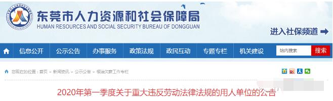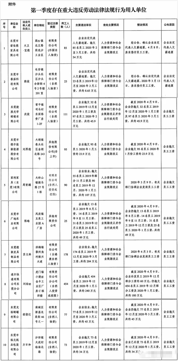 5月10日,筆者從東莞市人力資源和社會保障局獲悉,2020年一季度,東莞市存在重大違反勞動法律法規行為的用人單位共10家,全都牽涉欠薪問題。