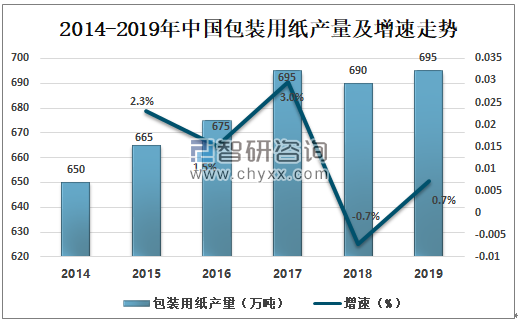 一、包裝用紙現(xiàn)狀 快遞業(yè)務(wù)的收入規(guī)模和快遞數(shù)量都呈現(xiàn)出井噴式增長,即便近年來增速有所下滑,但是也還是維持在20%以上的超高增長速度,屬于行業(yè)從初期的野蠻式增長到逐漸成熟階段的自然過渡。電商業(yè)務(wù)的快速發(fā)展離不開與之相配的線下物流和快遞配送,受電子商務(wù)、快遞物流快速發(fā)展的拉動。包裝用紙從2014-2017年一直是上漲趨勢,2018年包裝用紙產(chǎn)量690萬噸,2019年包裝用紙產(chǎn)量為695萬噸,同比增加0.7%。 2014-2019年中國包裝用紙產(chǎn)量及增速走勢