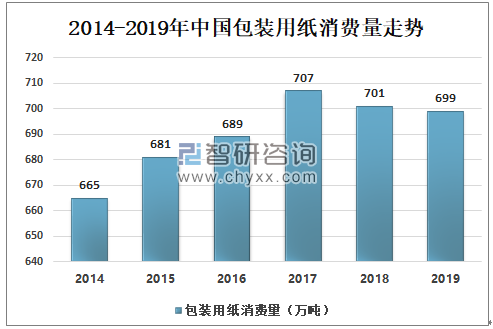 數(shù)據(jù)來源:中國造紙年鑒、智研咨詢整理 然而最近的幾年里,中國消費(fèi)品出口增速下降,甚至有部分產(chǎn)品的產(chǎn)地從中國轉(zhuǎn)移到了其他新興市場,導(dǎo)致相應(yīng)的出口商品包裝用紙需求增速放緩。從2017年包裝紙消費(fèi)量的707萬噸開始下降到2019年包裝用紙消費(fèi)量699萬噸。 2014-2019年中國包裝用紙消費(fèi)量走勢