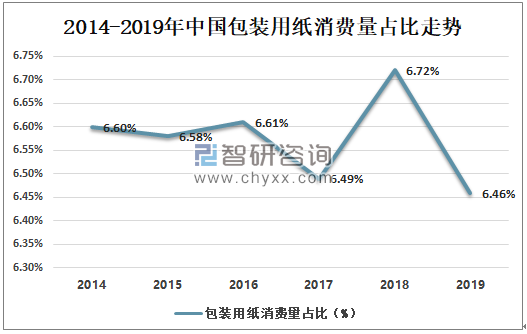 數(shù)據(jù)來源:中國造紙協(xié)會、智研咨詢整理 包裝紙板早已成為造紙行業(yè)中最重要的紙種之一,其需求占據(jù)著造紙行業(yè)總體需求的近60%。隨著包裝行業(yè)的多元發(fā)展,包裝紙板產(chǎn)品在人民生活中的作用越來越明顯,對包裝紙板的依賴性也越來越強(qiáng)。包裝紙板行業(yè)的發(fā)展又面臨著必須不斷適應(yīng)更高的環(huán)保標(biāo)準(zhǔn)、解決原料短缺及中美貿(mào)易戰(zhàn)的不確定性等多項(xiàng)挑戰(zhàn)。包裝用紙消費(fèi)量走勢占比維持在6.5%。 2014-2019年中國包裝紙消費(fèi)量占比走勢