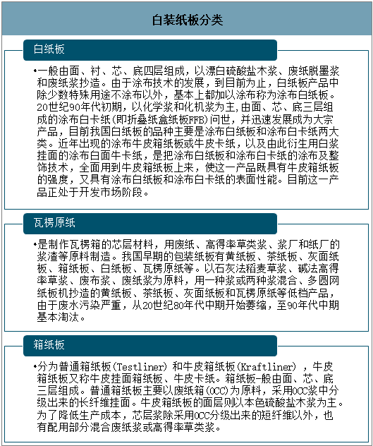 數(shù)據(jù)來源:中國造紙協(xié)會、智研咨詢整理 二、包裝用紙板現(xiàn)狀 1、概況 包裝紙板分為自紙板、瓦楞原紙和箱紙板三大類。 包裝紙板分類